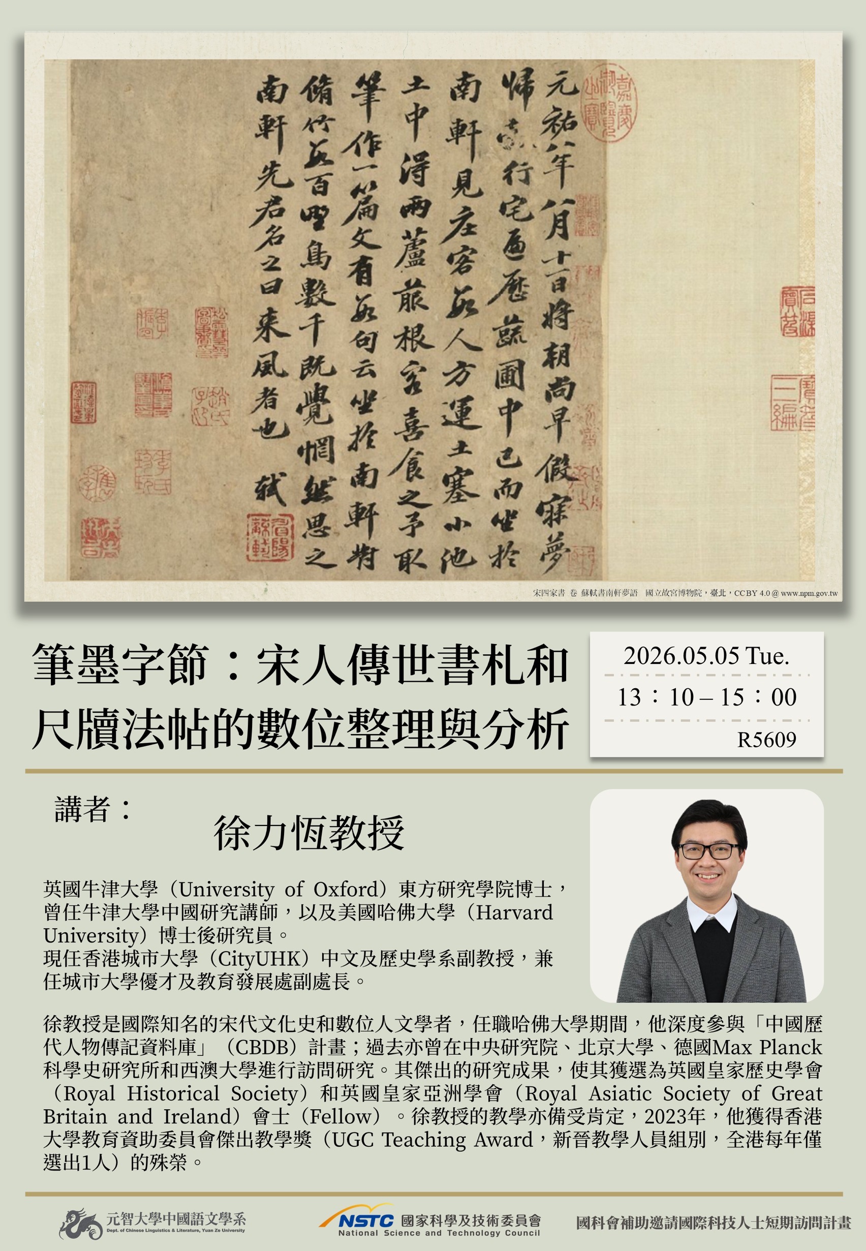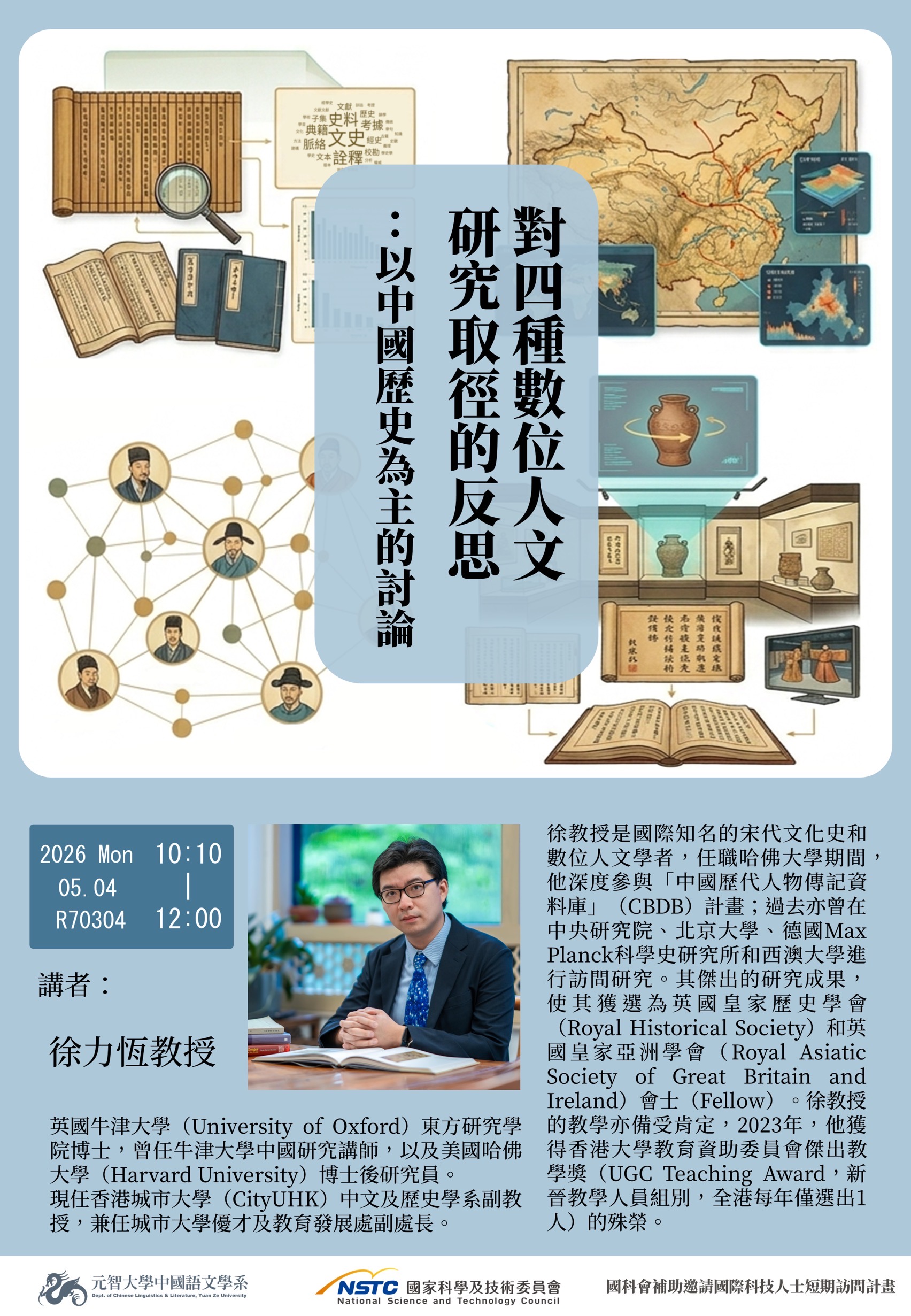 徐教授長期致力於宋代文化史與數位人文研究,曾參與「中國歷代人物傳記資料庫(CBDB)」計畫,並透過數據分析與文本整理,重新詮釋歷史人物與知識網絡。本次系列演講,將分別從「數位人文方法」與「文獻數位化實務」兩個層面切入,兼具理論深度與實務經驗,對本系師生具有高度啟發性。